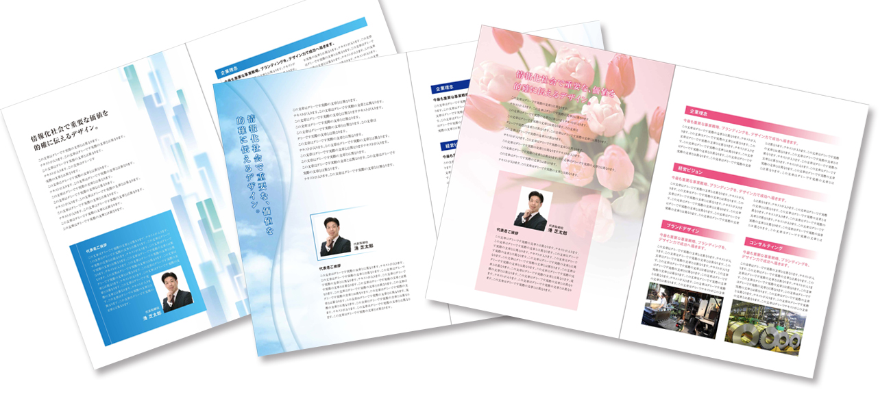 会社案内のデザインを細かく指定する必要はありません。会社のコーポレートカラーやご要望を教えてください。(イメージしているものの資料があるとより分かりやすいです。)デザインのクオリティが高い会社案内やパンフレットになるようにスタッフ一同努力していきます。