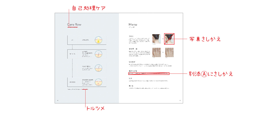 会社案内のデザインが組みあがったら内容を確認します。誤字脱字がないか、内容に間違いがないか、デザイン面の変更は必要ないかを確認します。修正したい点があったら下記のように直接校正紙(デザイン確認用の紙)に修正指示を赤ペンで書き込みます。これを赤字といいます。ここも会社案内作成過程において大事な作業です。