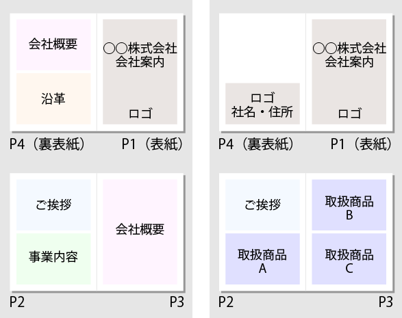 例えば一番簡単な4ページの会社案内も単純に会社概要のみを案内するパンフレットにするのか、サービス・取扱い商品を載せて営業資料的なパンフレットにするのかによって構成が変わります。それぞれ大体右記のような構成になります。